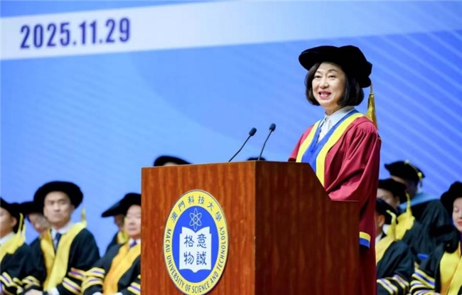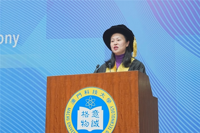 荣誉院士代表陈志玲女士在致辞中,对获授荣誉院士铭感殊荣,并将这份荣誉归功于企业全体同事以及澳门综合旅游休闲业的全体同仁。她分享了自己与澳门深厚的情缘,从家族历史到个人归根澳门的经历,表达对祖国感召与澳门这片土地的深切认同。陈志玲指出,其企业不仅致力于商业卓越,更坚守与澳门共同成长的承诺,积极履行社会责任。她阐述了以「永利关爱」为核心的公益理念,并分享从中华传统文化中汲取的智慧——「天下大事,必作于细」,强调企业在商业运营与社会贡献中皆注重细节、务实前行。最后,她感谢澳科大为国家与澳门注入创新能量,并鼓励学子积极学习、勇于创新,将这份荣誉化为对未来社会的贡献与接力。